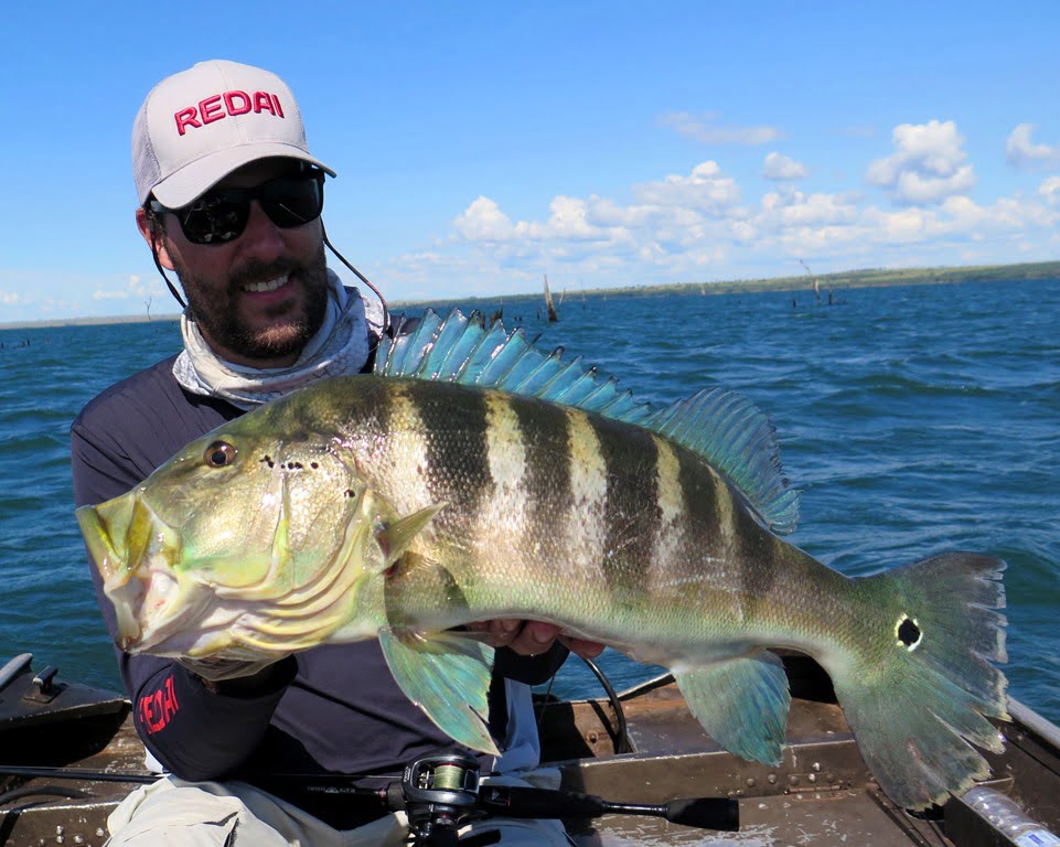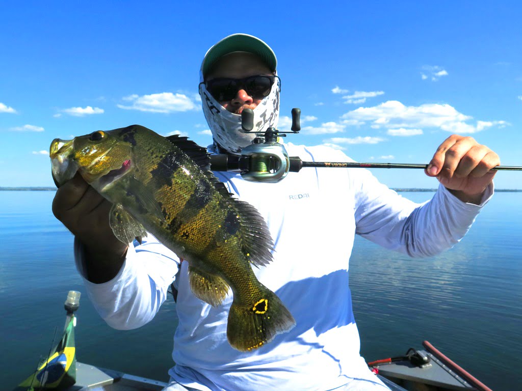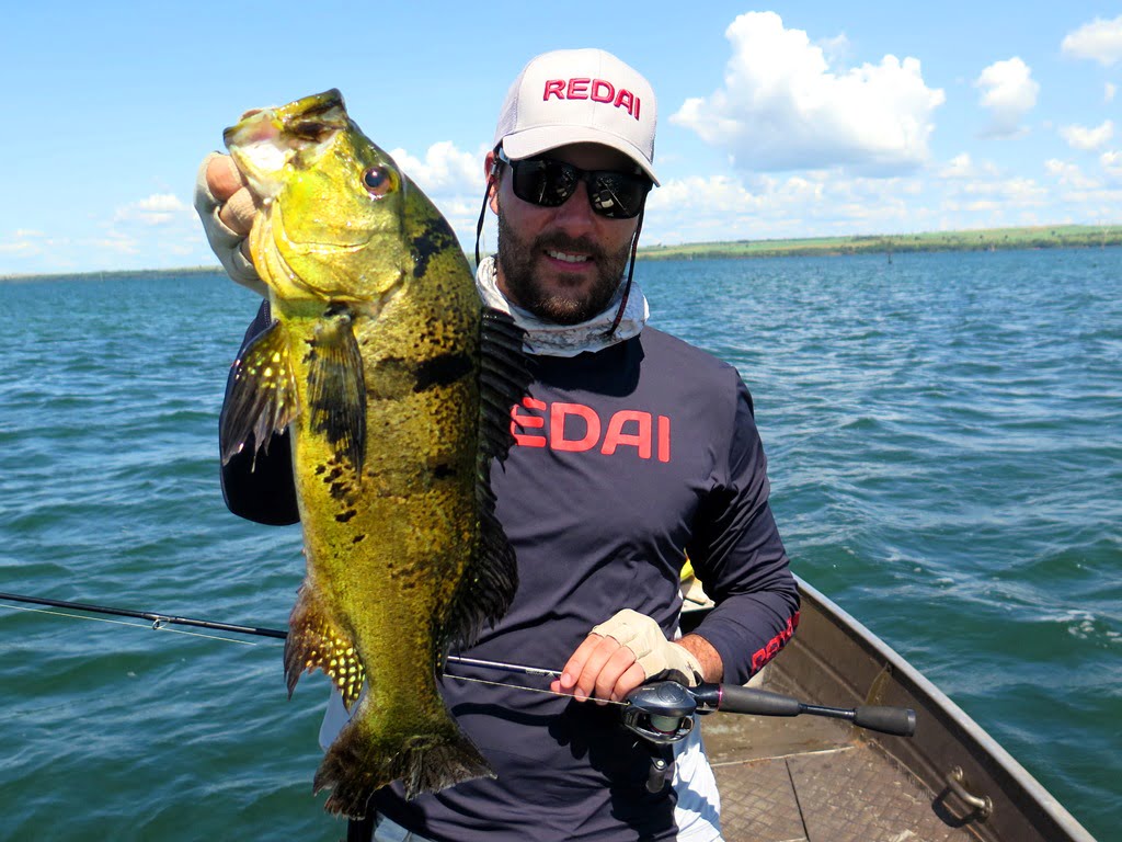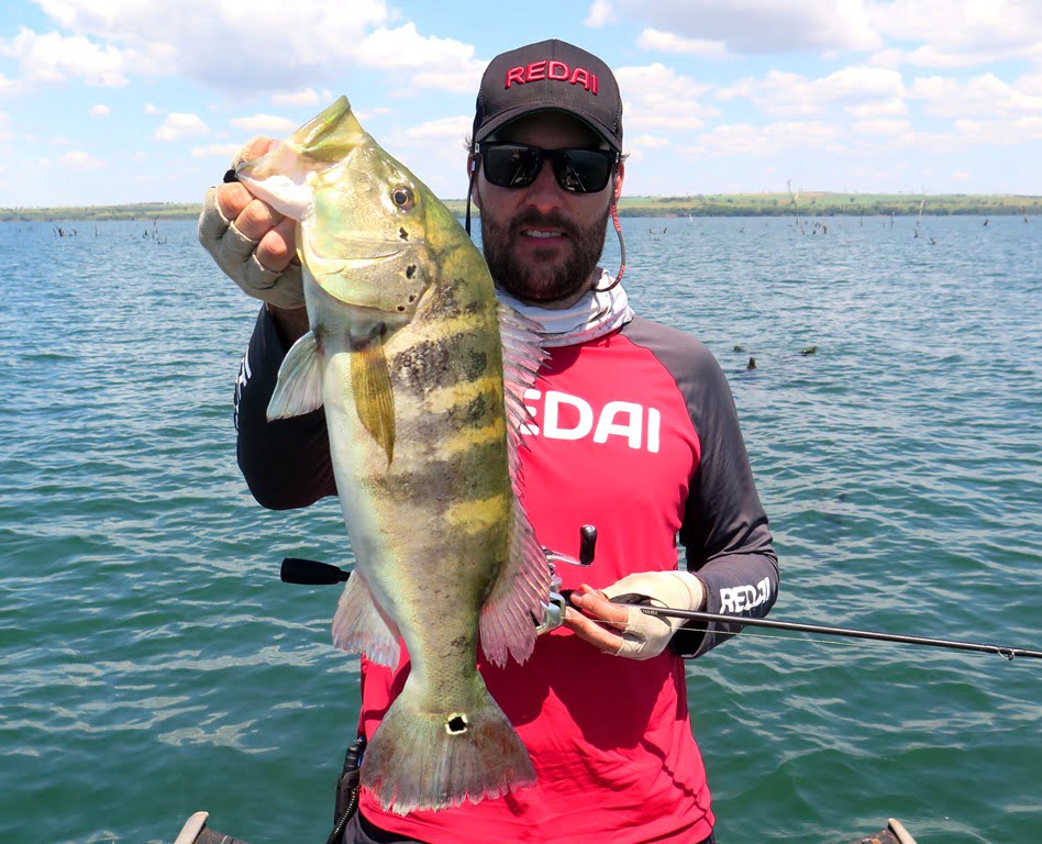 Sabendo das dificuldades, resolvemos levar lanche para aproveitar o dia todo pescando, e a decisão foi acertada, porque por volta de 12:30h (horário em que geralmente estaríamos parados almoçando), capturei um tucunaré azul de 49 cm em um raseiro com a água totalmente transparente. O peixe brigava perto da superfície e vimos um gigante acompanhando a fêmea que estava fisgada, pedi que o parceiro jogasse imediatamente atrás de meu peixe, ele acertou o arremesso na cara do monstro que não hesitou em abocanhar a isca e brigar demais! O peixe tomou muita linha e brigou no limpo, e mesmo com duas garatéias abertas e uma quebrada, saiu para a foto. O recorde pessoal do parceiro Parra, monstro de tucunaré azul de 62 cm!