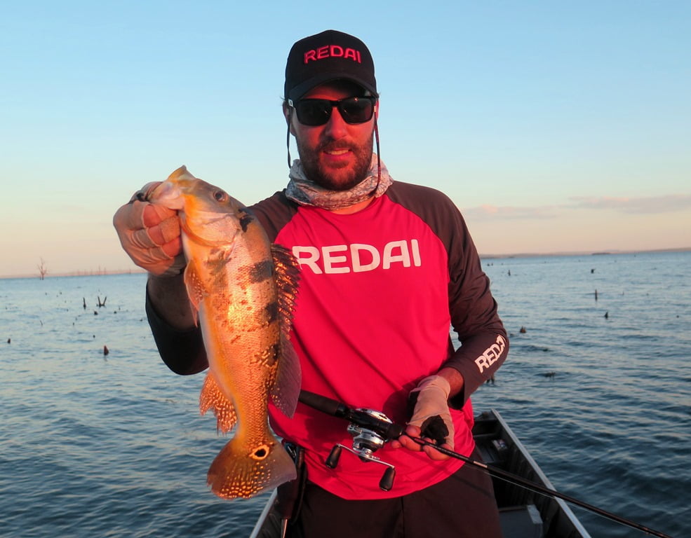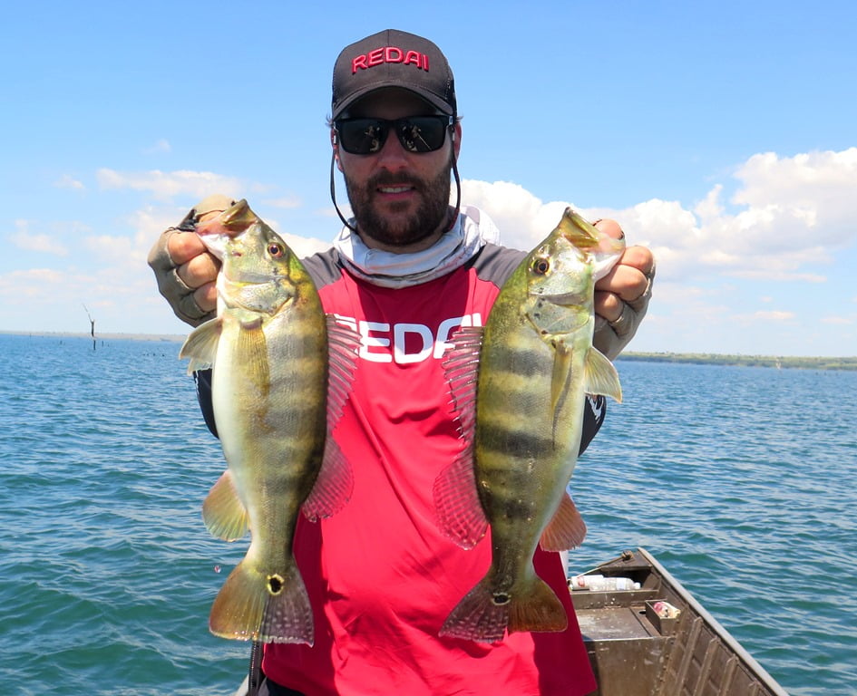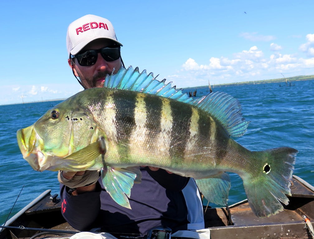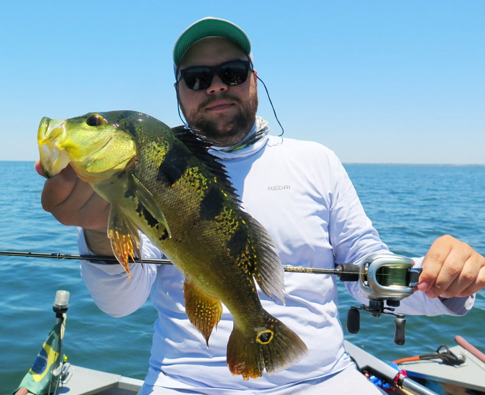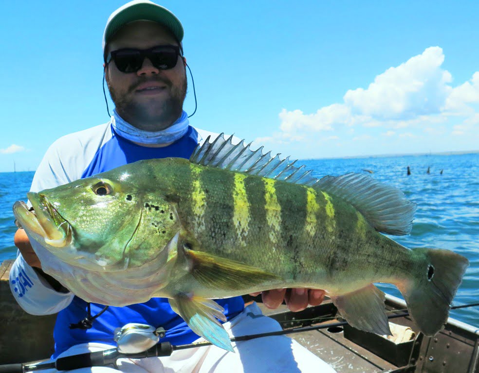 Sabendo das dificuldades, resolvemos levar lanche para aproveitar o dia todo pescando, e a decisão foi acertada, porque por volta de 12:30h (horário em que geralmente estaríamos parados almoçando), capturei um tucunaré azul de 49 cm em um raseiro com a água totalmente transparente. O peixe brigava perto da superfície e vimos um gigante acompanhando a fêmea que estava fisgada, pedi que o parceiro jogasse imediatamente atrás de meu peixe, ele acertou o arremesso na cara do monstro que não hesitou em abocanhar a isca e brigar demais! O peixe tomou muita linha e brigou no limpo, e mesmo com duas garatéias abertas e uma quebrada, saiu para a foto. O recorde pessoal do parceiro Parra, monstro de tucunaré azul de 62 cm!