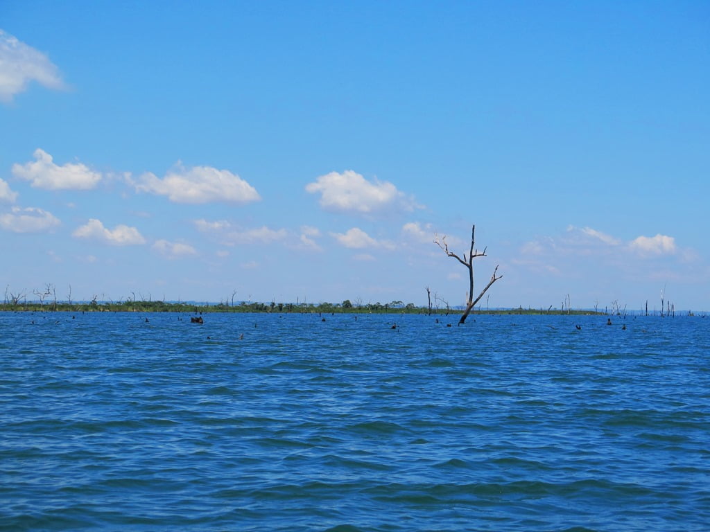 À tarde o vento parou, mas o peixe ficou ainda mais manhoso. Vimos inúmeros azuis, e grandes, seguirem nossas iscas até do lado do barco e refugarem todas as iscas possíveis. Perdi um grande tucunaré azul que explodiu na superfície mas largou a isca no toco e escapou. Com bastante empenho fomos capturando alguns peixes: