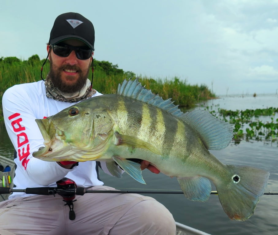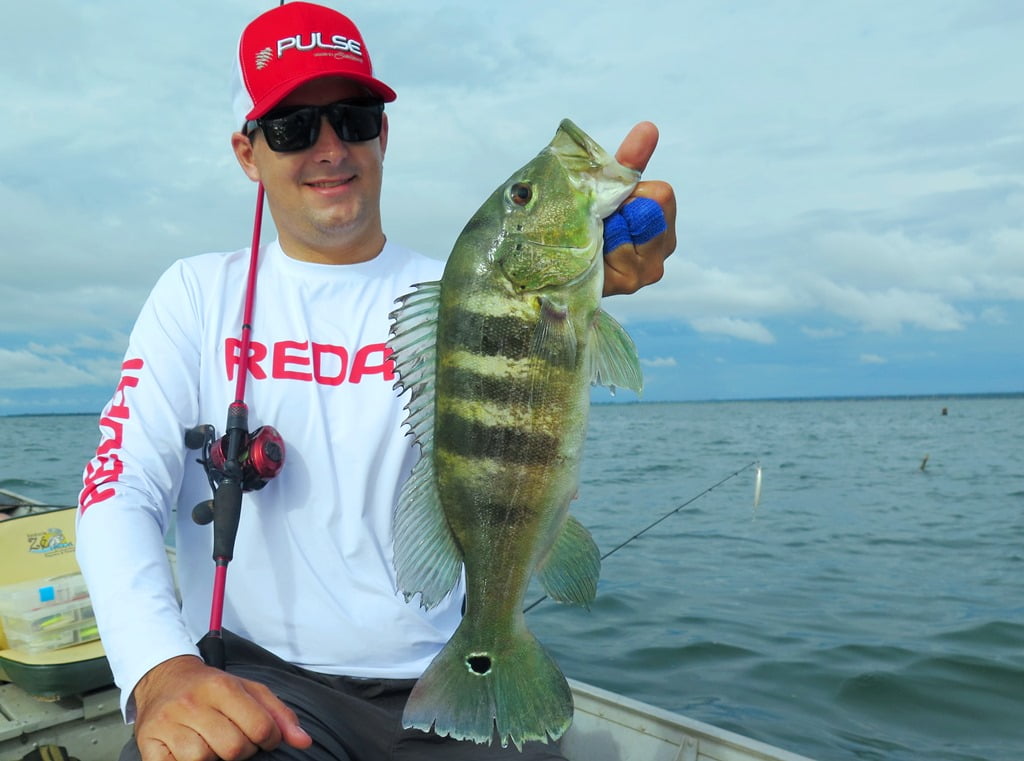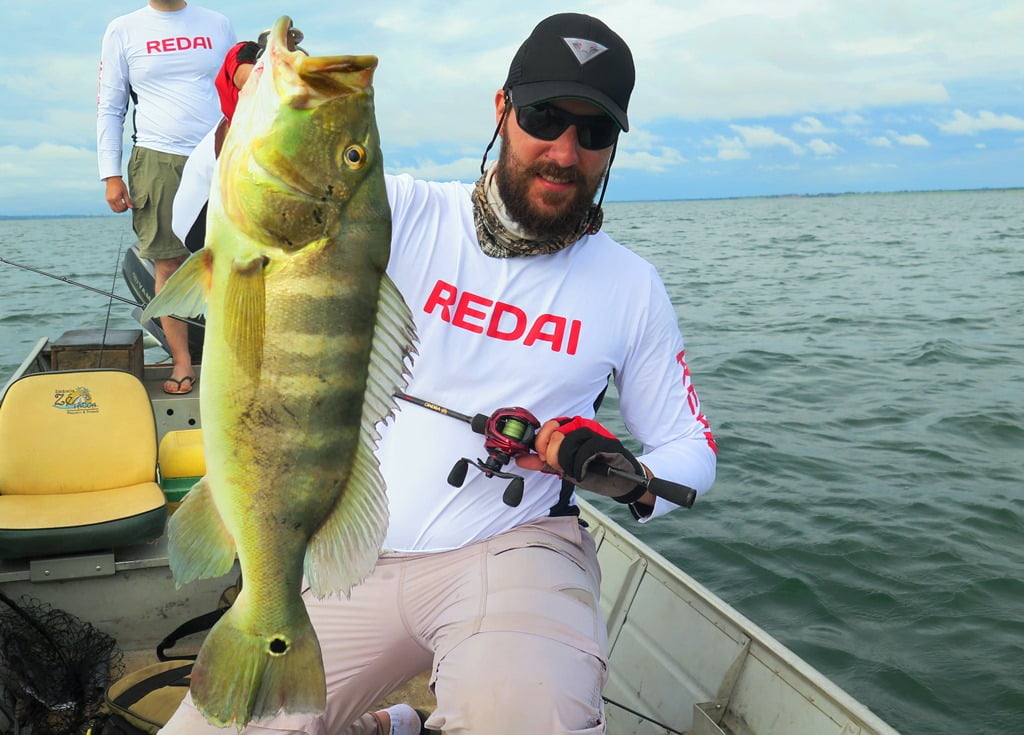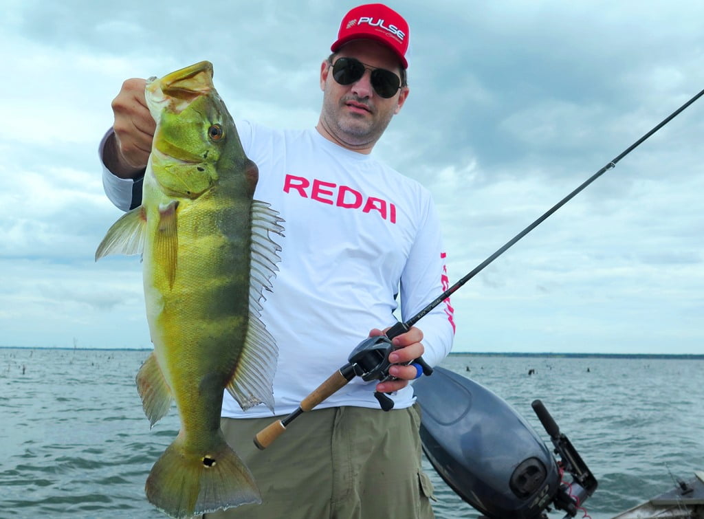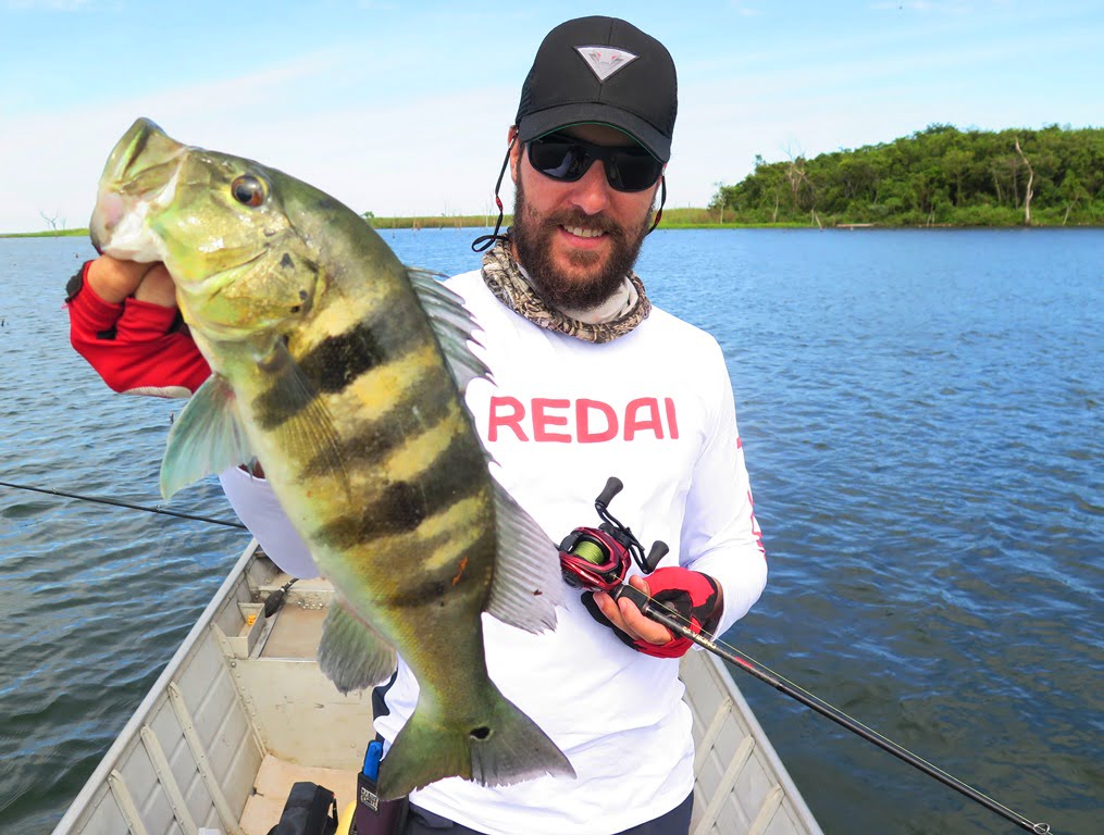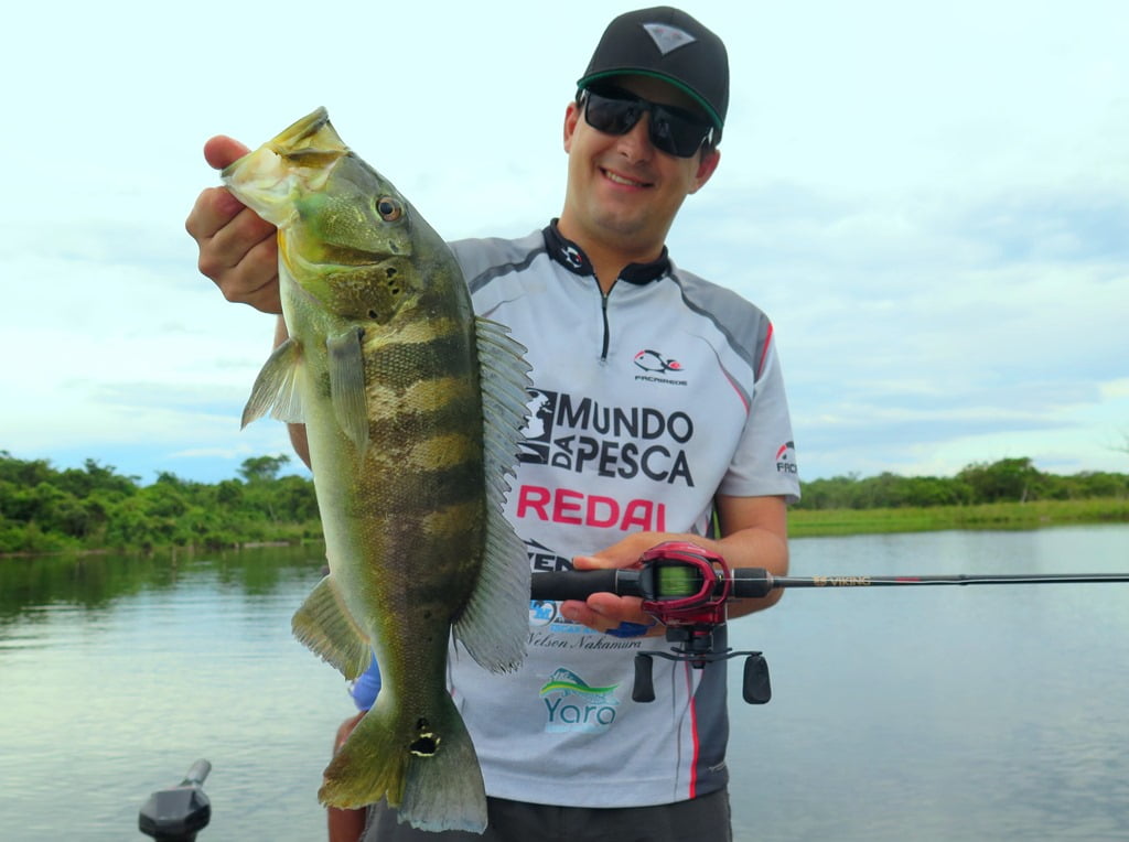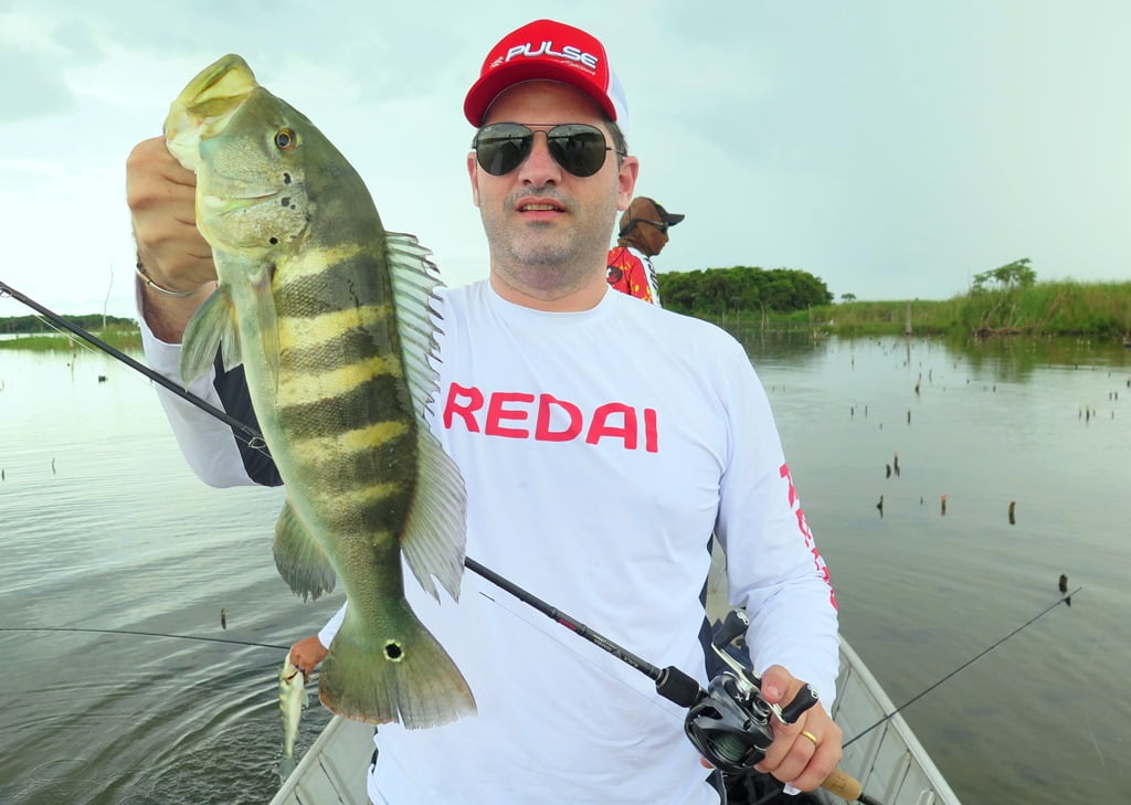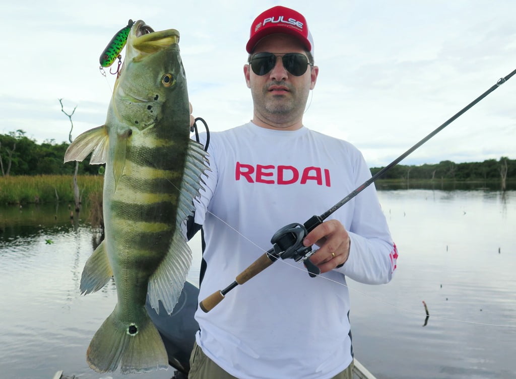 Vara Redai Viking 5’8 14lb + carretilha de perfil baixo com linha 40lb e leader 0,47mm + iscas twitch bait ou superfície (Flash, Curisco 70, Bonnie 95, Zig Zarinha)
