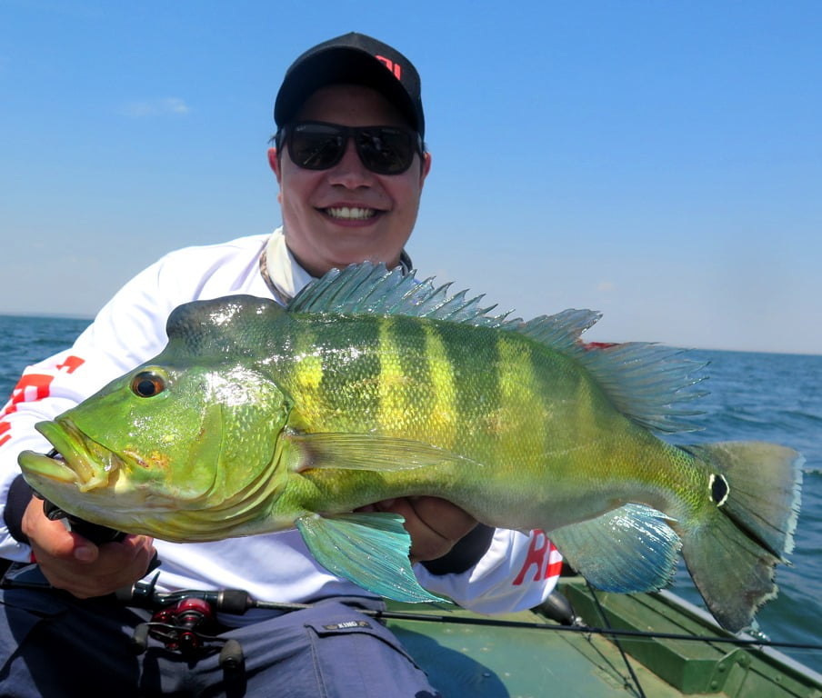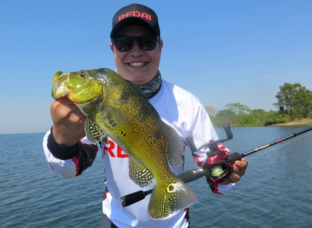 André capturou dois tucunas dignos de foto, como esse bonito tucunaré amarelo: