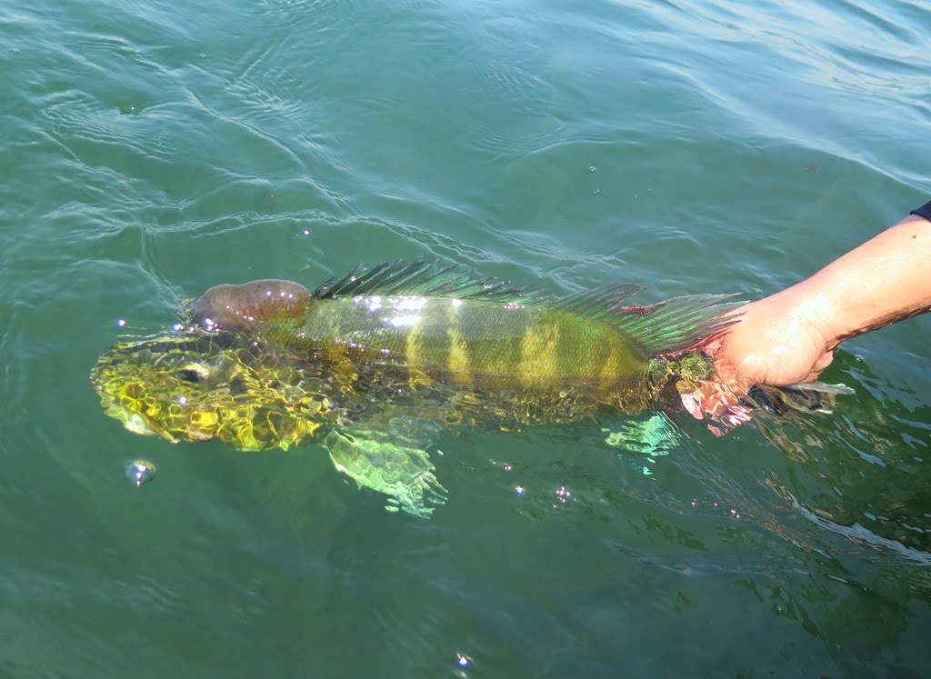 Logo nos primeiros arremessos vimos bons azuis seguirem a isca até pertinho do barco, logo depois o André fisgou mais um lindo peixe no visual. Um dos tucunarés azuis mais bonitos que já vi, de coloração única!