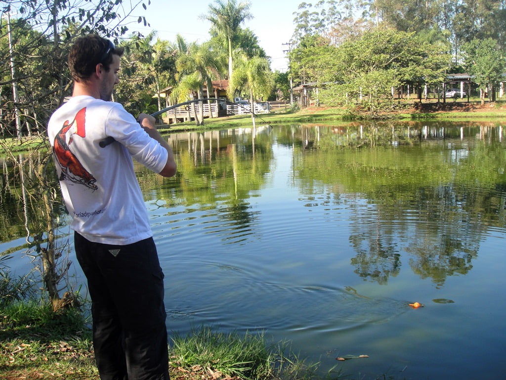 – Não fisgue de jeito nenhum, apenas estique a linha e trabalhe lentamente o peixe. A boca da carpa é muito frágil e sensível, fisgadas podem rasgá-la e ocasionar perda do peixe.