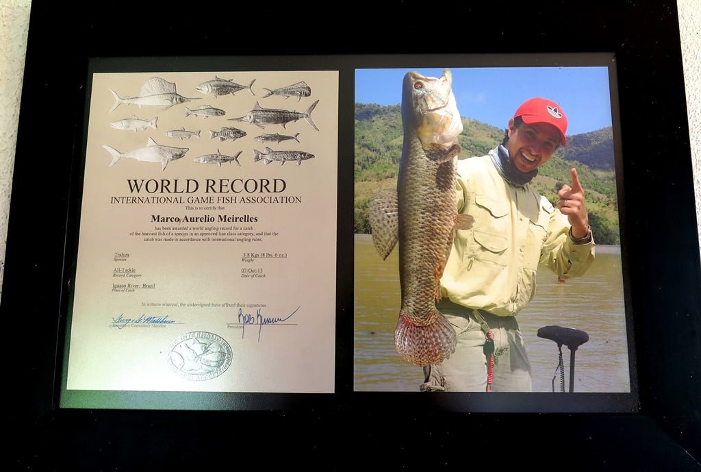 Curiosidade:, Na pousada vi um quadro de recorde da IGFA (International Game Fishing Association), órgão americano que homologa e registra os recordes mundiais das espécies. No caso, em 2013, Marco capturou, no alagado do Rio Iguaçu, uma traíra de 3,8kg, exemplar este que foi homologado oficialmente. Porém alguns dias depois, o pescador Luis Castro, capturou um exemplar de 4kg, em uma região próxima, no Rio Timbó. O exemplar também foi homologado superando o recorde do Marco. Lembrando que tem como homologar um recorde soltando o peixe, e eles fizeram, basta seguir os procedimentos da IGFA.