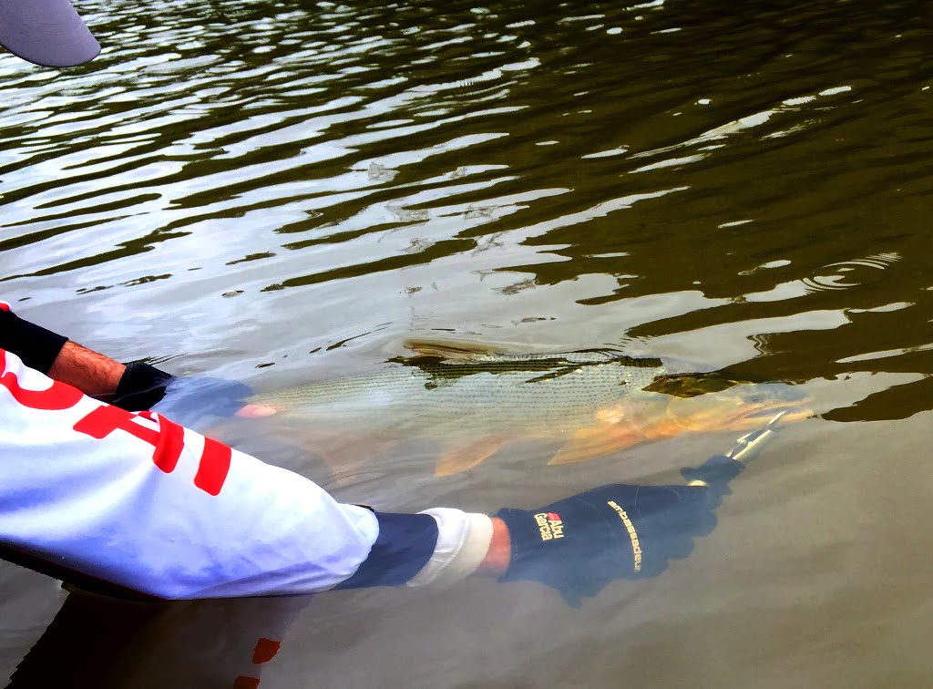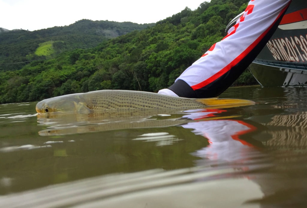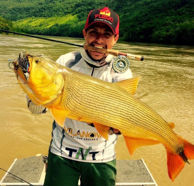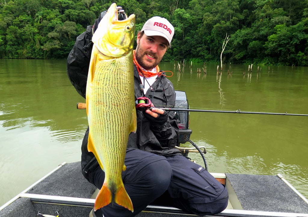 Avistamos alguns dourados caçando mas não estavam muito ativos. O Marco capturou um dourado menor, e eu também, mas faltou as fotos que não fizemos devido à chuva. Logo depois esse saiu para a foto: