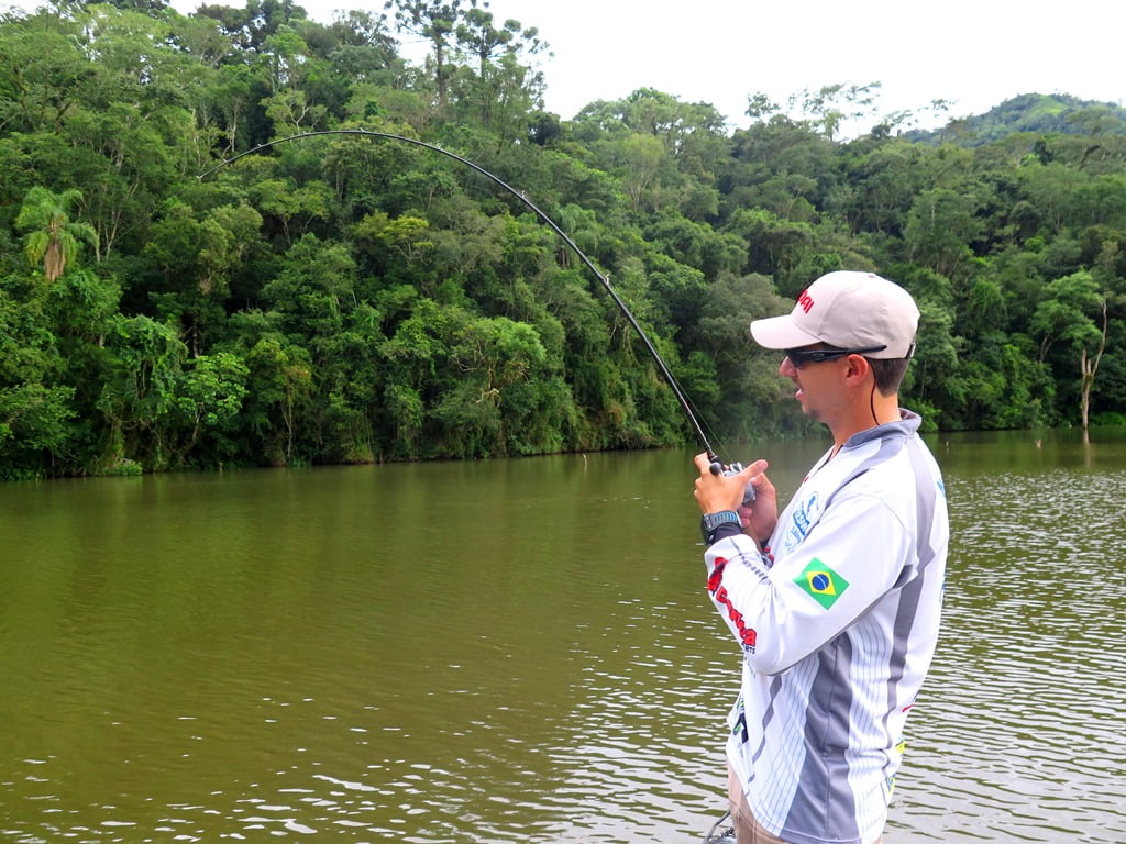 Começamos a arremessar e com pouco tempo de pescaria um peixe bateu na isca do meu irmão e não ficou, já animou. Subimos novamente e no mesmo local ele engata o seu peixe, muita tensão na briga, vários saltos e peixe embarcado! 10 lb / 4,5kg.