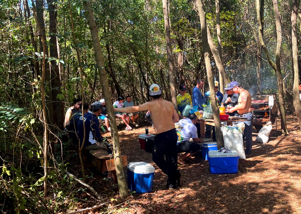 A noite a reunião da turma foi na churrasqueira, recepcionados com uma deliciosa costela, chopp gelado e muita resenha! Realizamos o sorteio dos guias e a turma preparou o material de pesca.