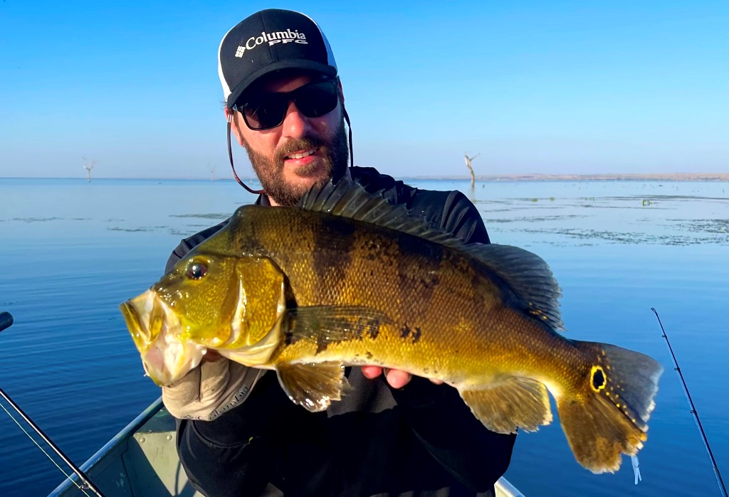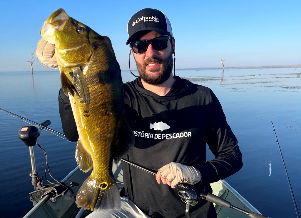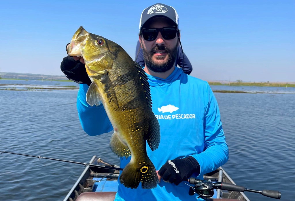 Os peixes comeram bem, eu e o Kiko achamos vários cardumes, tanto de tucunarés azuis como de amarelos. Peixes na superfície, jig e meia água!