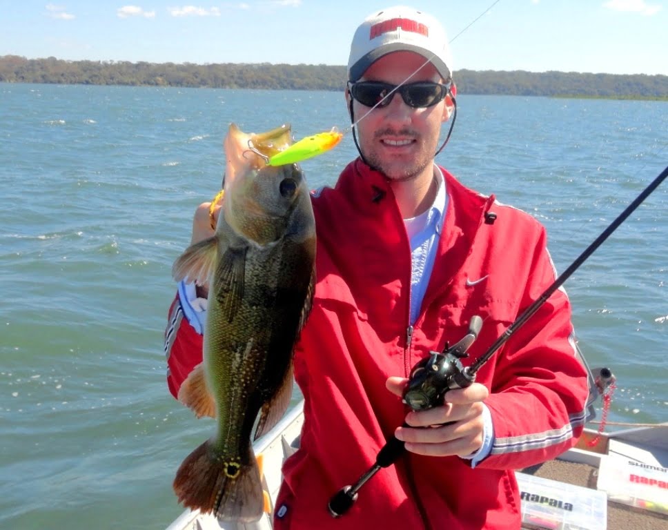 Como no dia anterior os peixes estavam pegando melhor em iscas menores, coloquei a isca Yo Zuri 3D 70 minnow verde-limão, isca essa que pegou muito peixe no dia anterior, e nem no décimo arremesso do dia vejo (com a água transparente pesca-se no visual) um enorme tucunaré azul atacando a pequena isca, peixe engatado, tomou muita fricção, nessa hora lembrei da minúscula garatéia original da 3d minnow, do leader que não troquei, da linha fina, da vara de 14lbs e do tanto de estrutura que tinha em volta do peixe, deixei a fricção mais solta, o peixe correu embaixo das algas, voltou, subiu, tomou mais uns 10m de linha e depois, se entregou! Recorde pessoal de tucunaré azul batido, azulão de 67cm e mais de 4kg de peso: