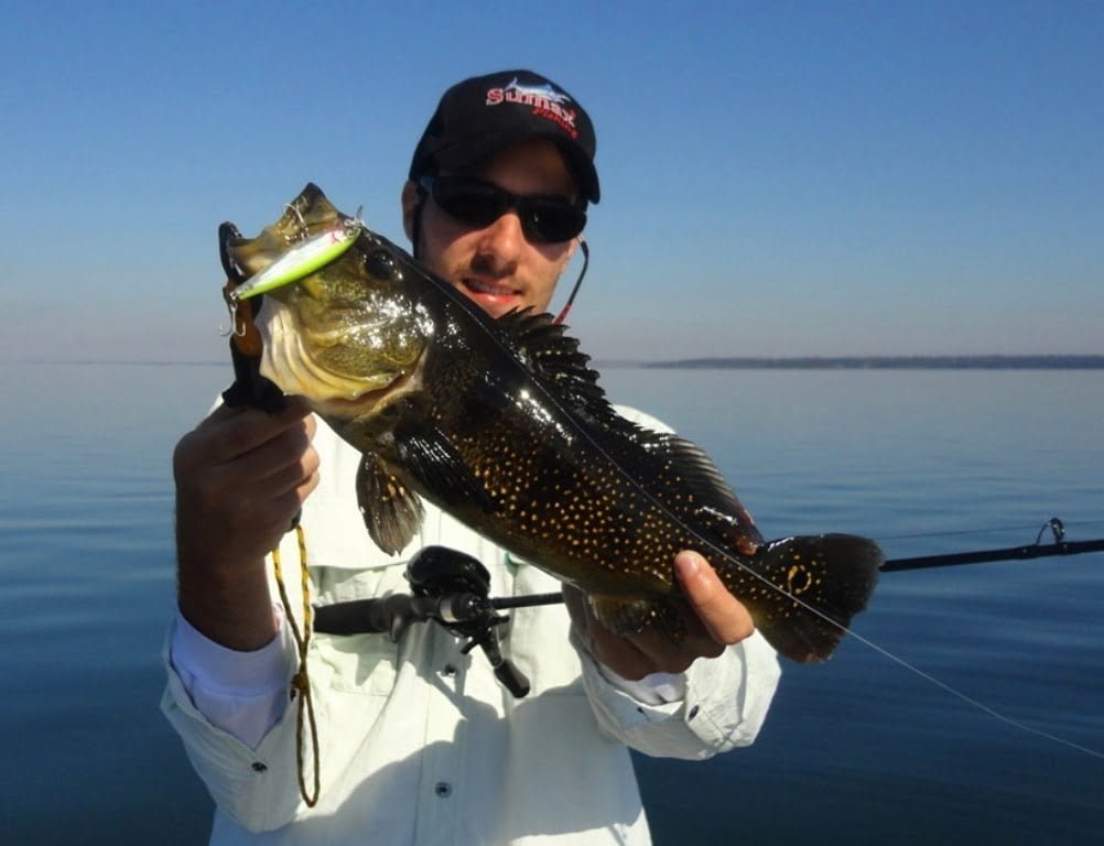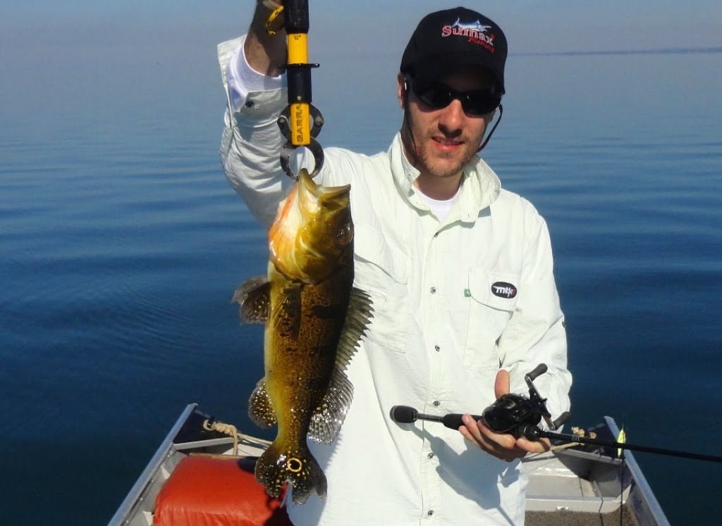 Primeiro ponto e como a água é transparente, vimos vários tucunarés seguindo as nossas iscas até a beira do barco, e depois refugando. Pegamos muitos tricks sem foto, muitos deles, filhotes de azuis, bom saber que o peixe está reproduzinho muito na região.