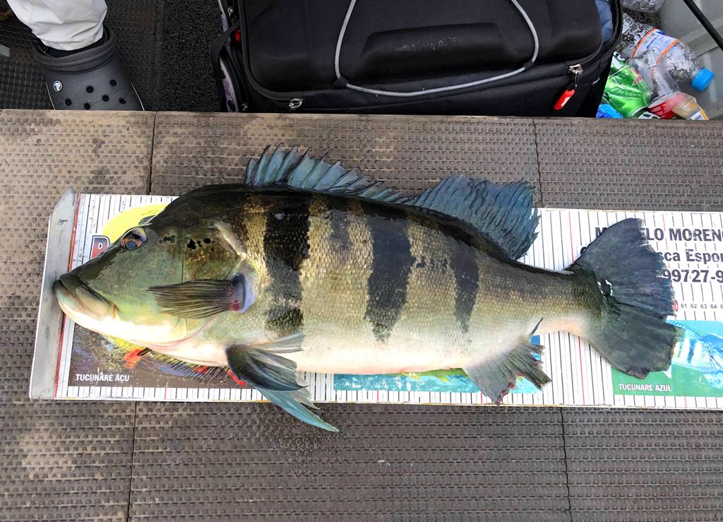 Já passava das 18h, no caminho de volta para a pousada, o guia Marcelo parou próximo a uma ilha e contou a história recente de um cliente que perdeu um gigante ali alguns dias atrás. Ele indicou o exato local de arremesso depois de contar o acontecido, eu arremessei primeiro e nada, o Pedro jogou o jig logo atrás e o peixão pegou logo na caída! Briga intensa e azulão embarcado! Muita comemoração, um peixe desse tamanho em pleno inverno é raríssimo, superou todas as expectativas! Tucunaré azul de 61cm: