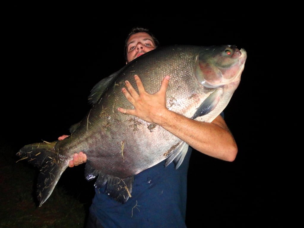 Já pronto para ir embora, vi que a minha bóia sumiu e o jeito foi fisgar forte, peixe na linha, muita briga e tomadas de linha de noite, adrenalina a mil e certeza de peixe muito grande, já estava praticamente escuro e assim tudo fica mais difícil, mas o peixe se rendeu e se tratava do 3° maior tambacu da minha vida, peixe pesado na balança digital, 26kg de brutalidade. Rápida sessão de fotos e devolver o peixe à água pois já passava a hora de ir embora.