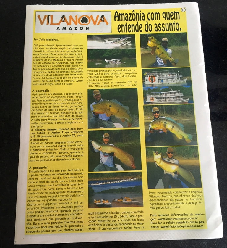 Matéria sobre minha pescaria na Amazônia no tradicional jornal Fishing Sports, que desde o ano de 1998 circula 10.000 exemplares mensalmente nos principais pontos ligado a pesca esportiva em Curitiba e região. Fico honrado, agradeço ao Reinaldo Sartorato e Victor Vilanova.