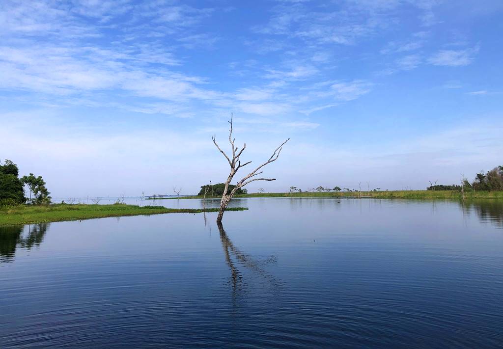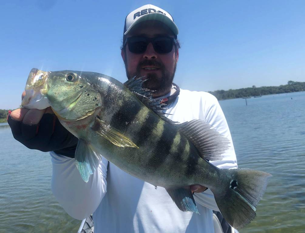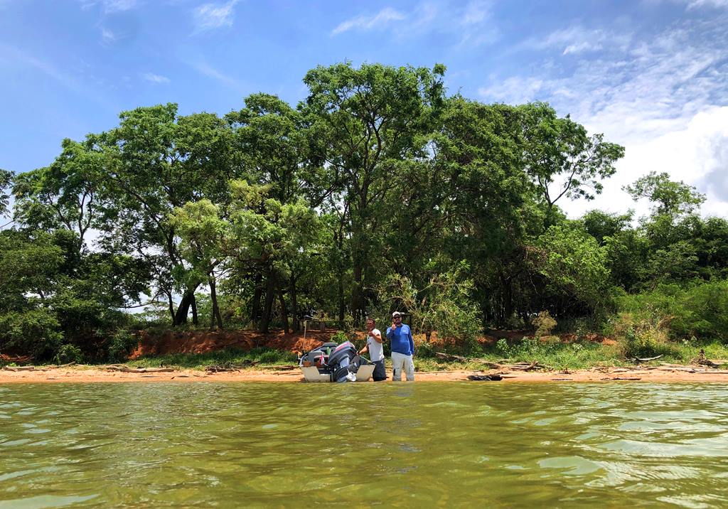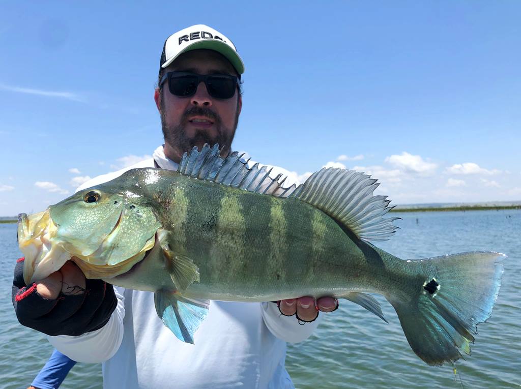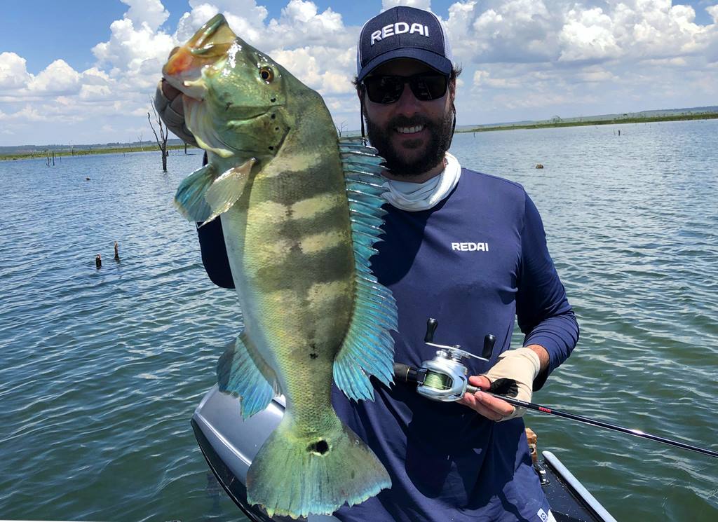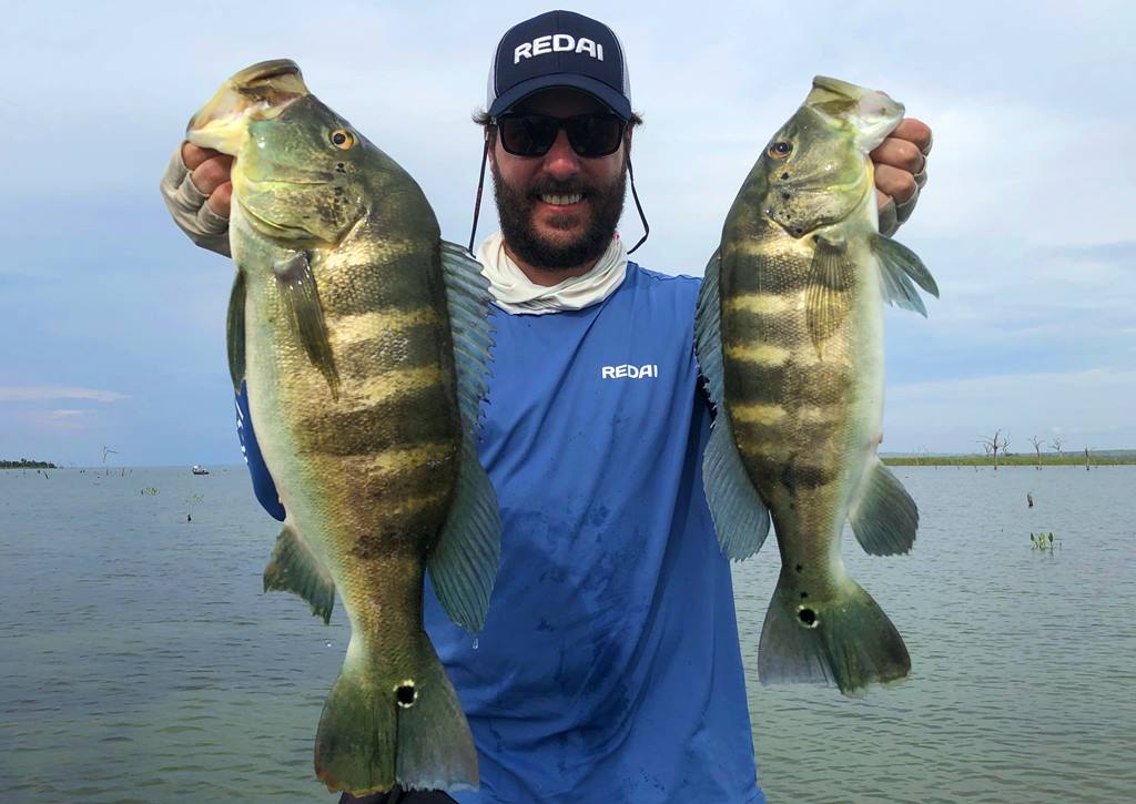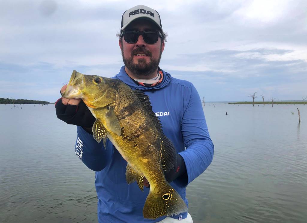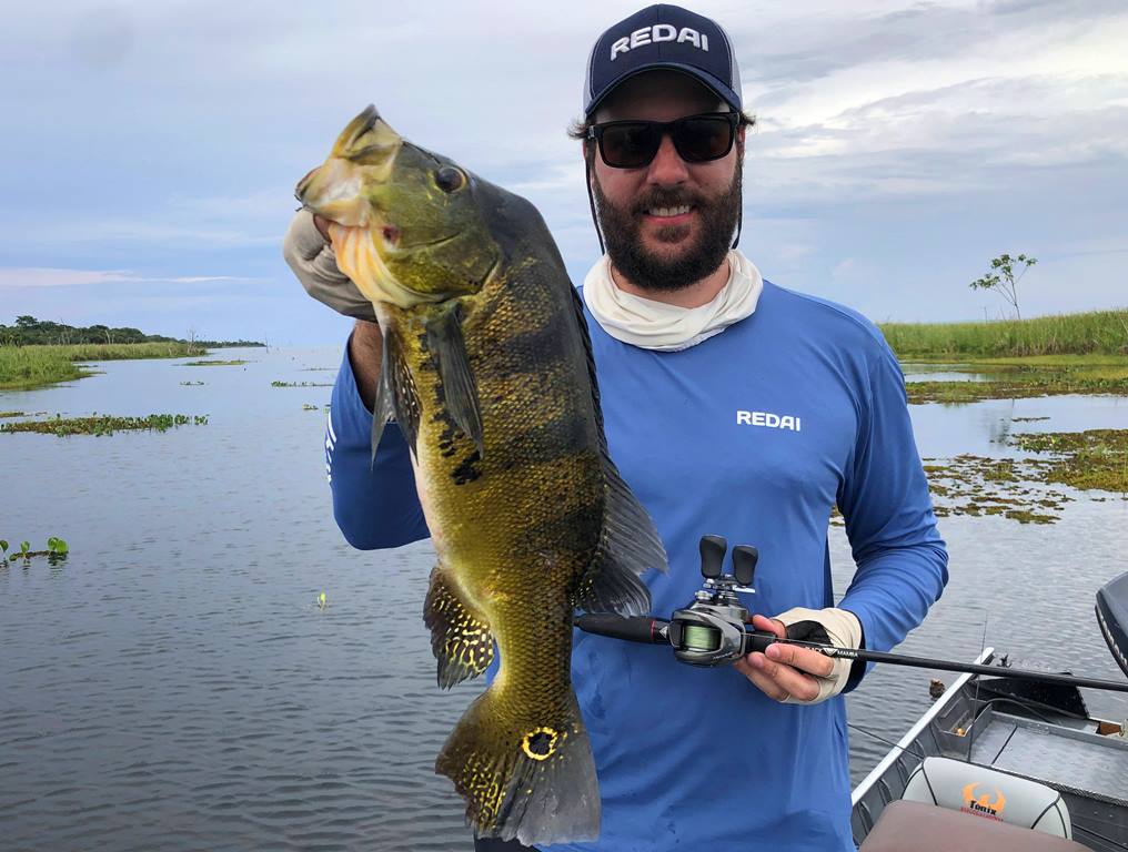 Segundo ele, os tucunarés amarelos estavam encardumados nas beiras das ilhas e nas lagoas, e os azuis andando em casal para fazer ninho e alguns já no ninho.