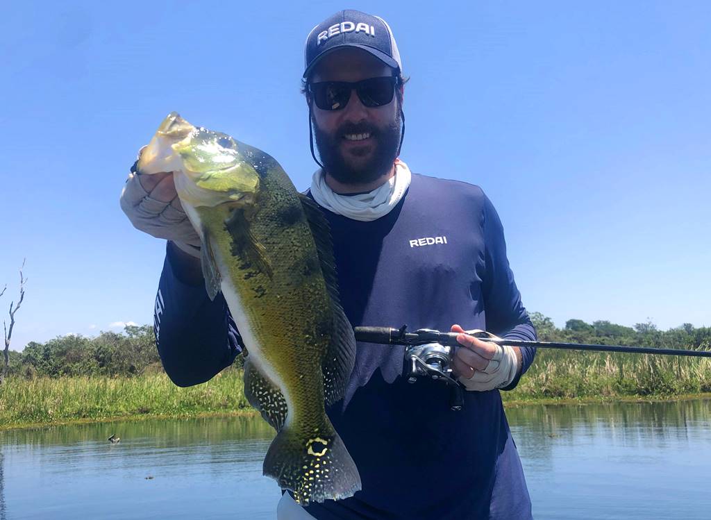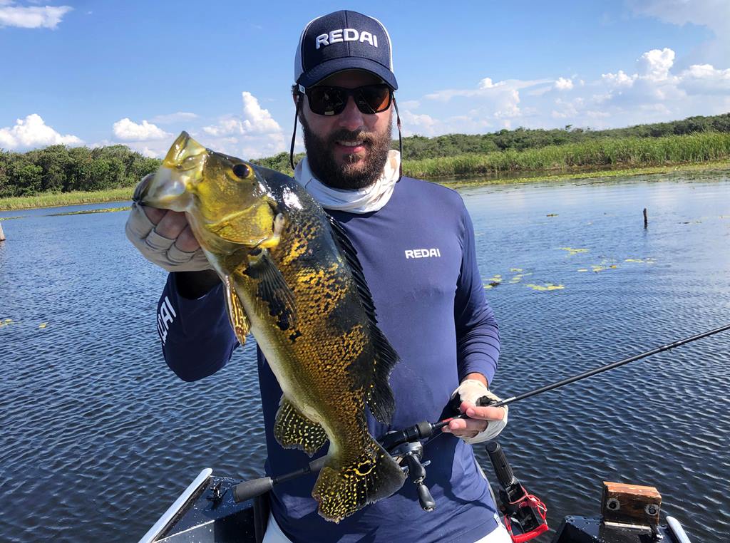 Começamos a manhã do primeiro dia nos divertindo com os tucunarés amarelos, foram muitos, na superfície com pequenos sticks e nos spinners leves montados com anzol in-line pois assim enroscava bem menos nas algas e taboas.