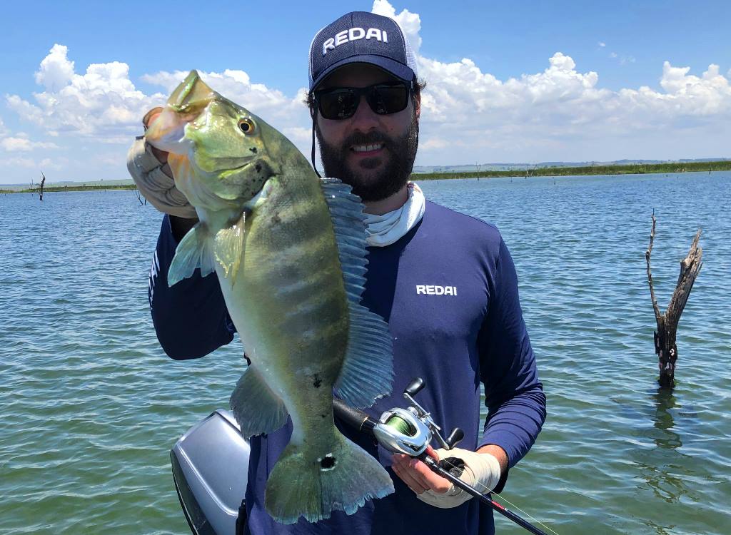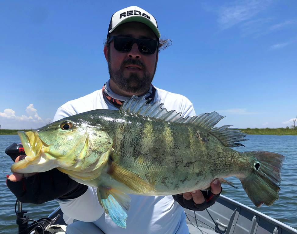 Começamos o dia no mesmo local do dia anterior onde pegamos muitos amarelos, mas logo de cara vimos alguns casais de azuis grandes, mas estavam ariscos, assustando e sumindo entre as algas. Mas um estava parado no ninho, o que facilitou a captura, ele refugou o jig mas não aguentou a isca de meia água caindo na cara dele! Lindo tucunaré azul: