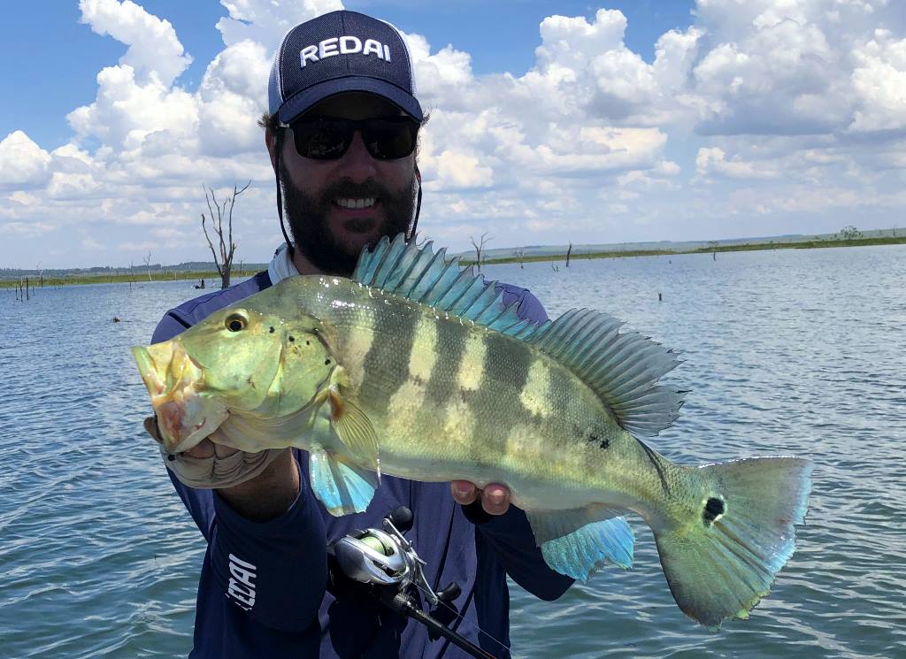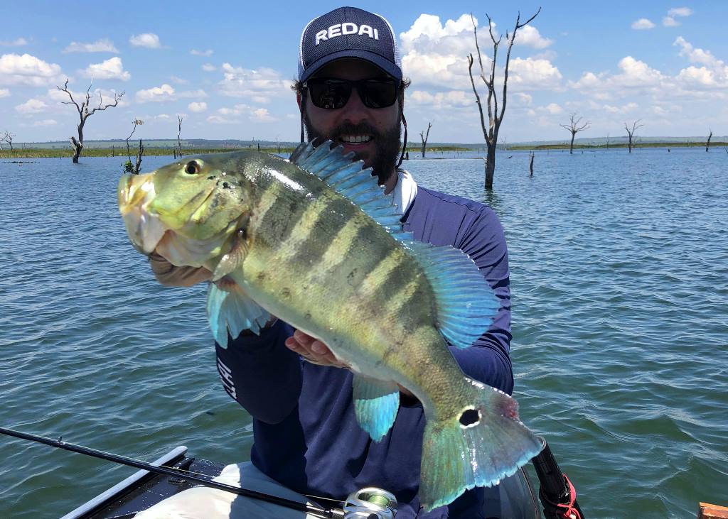 Um peixe mais bonito que o outro, esse com tom bem verde no corpo com azuis na nadadeira, lindo tucunaré!