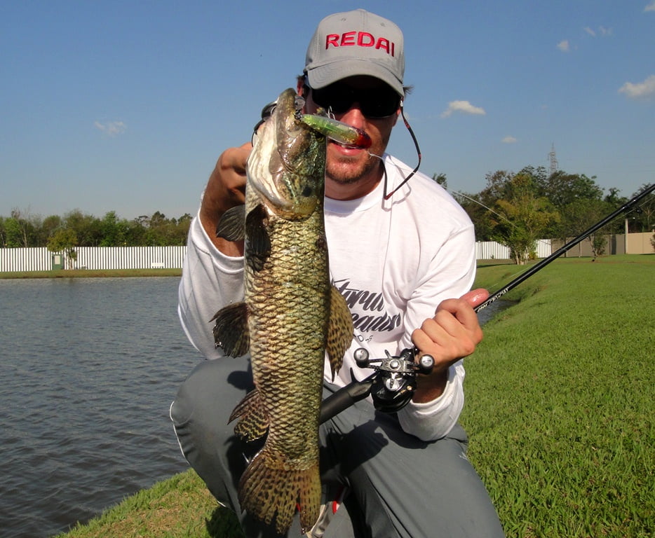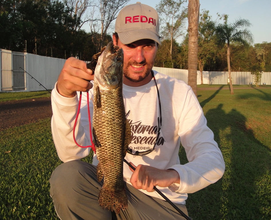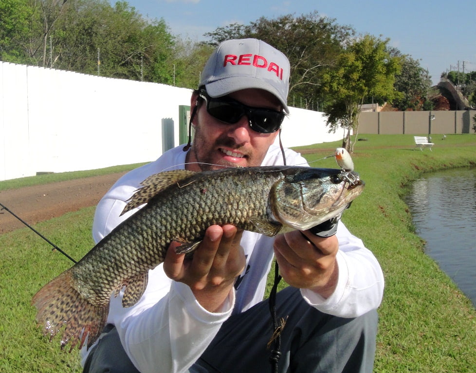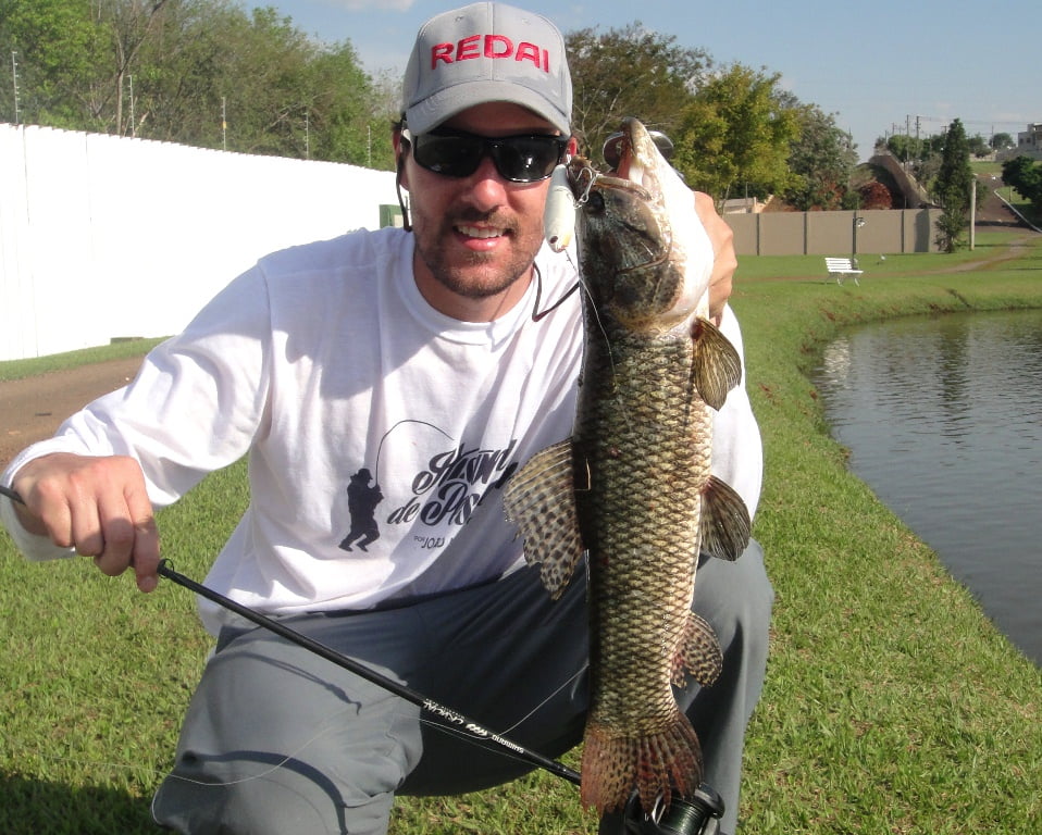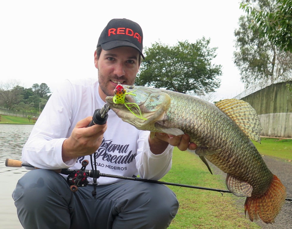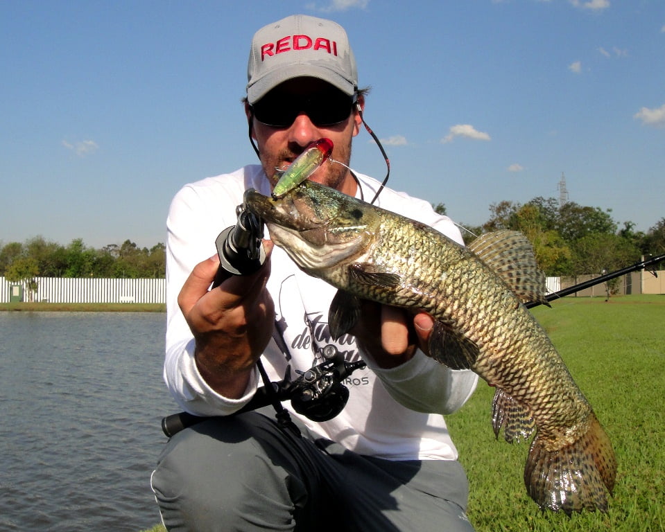 O trabalho é simples, basta dar pequenos toques com a vara, mais rápidos ou mais lentos, o importante é alternar, tremer a ponta da vara durante a recolhida também dá um bom resultado. Caso a traíra esteja manhosa e não ataque na superfície, uma boa opção é usar o spinnerbait ou o shad de silicone com recolhimento bem lento no fundo ou meia-água. No caso do shad a probabilidade de entrar outros peixes é maior, tive uma surpresa inusitada, um pacu de aproximadamente 8kg fisgado em uma pescaria de traíra com uma Black Mamba da Redai de 14lb, emocionante: