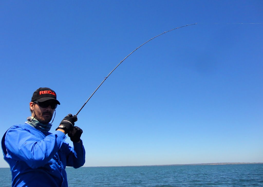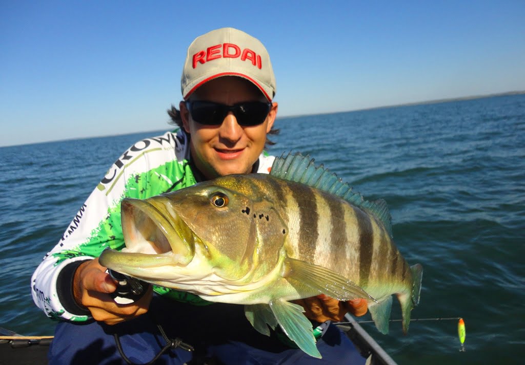 Voltando para a pescaria, o vento parou, então o guia Repolho colocou uma Zig Zara 110 e com muita insistência levantou os peixes, que apenas rebojavam timidamente atrás da isca, cobríamos com iscas de meia-água e assim entraram os peixes a tarde.