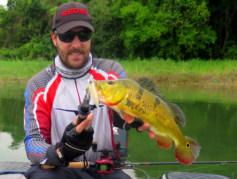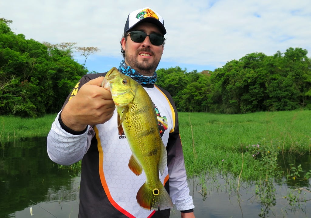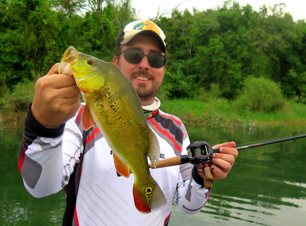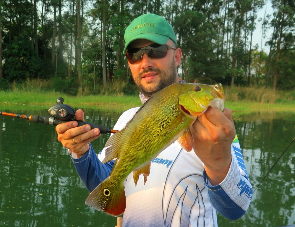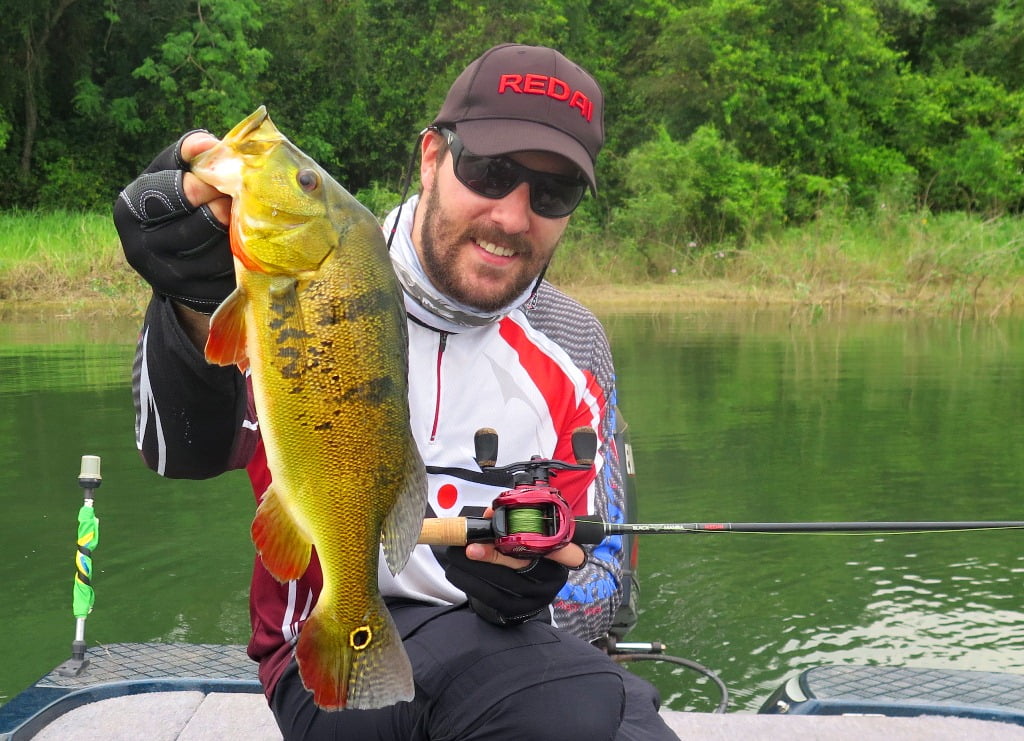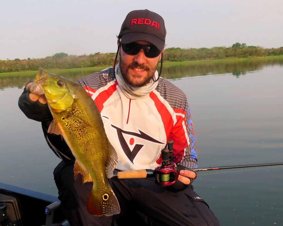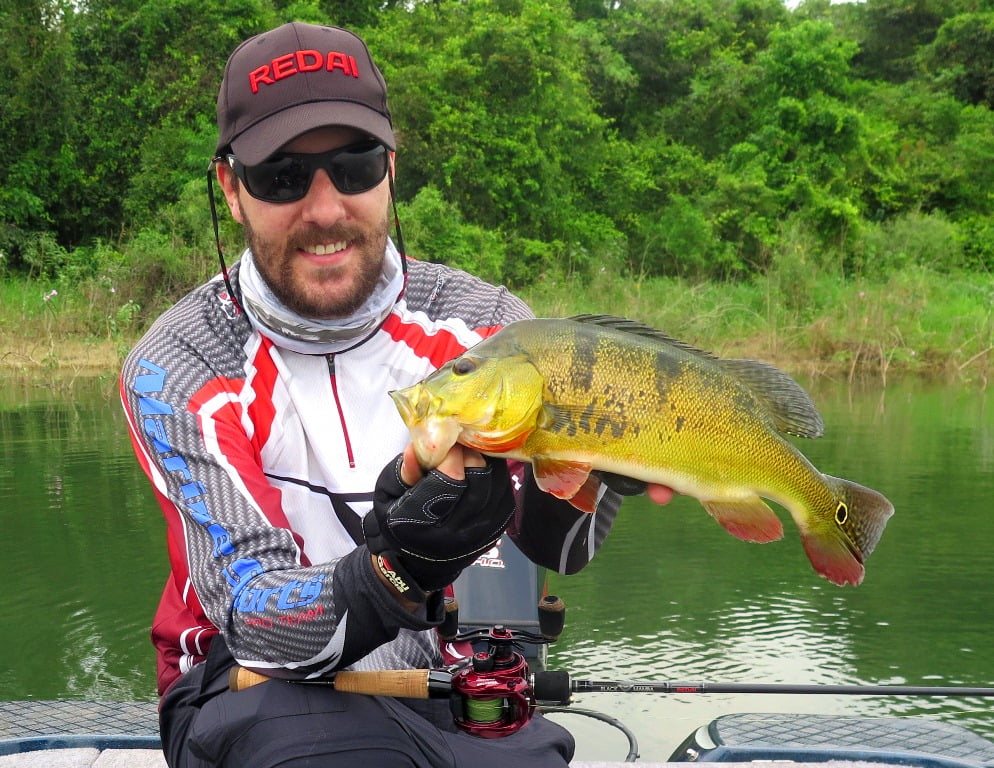 Thiago, pescando com a vara Redai Black Mamba 14lb e carretilha Venator, com um dos tucunarés que fisgou: