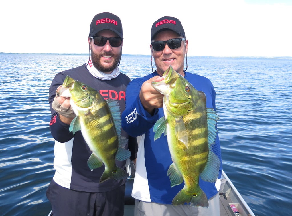 Na parte da tarde esquentou e o sol abriu, aí o peixe ficou bem mais ativo! Esses dois tucuninhas pegaram de uma vez na mesma isca: